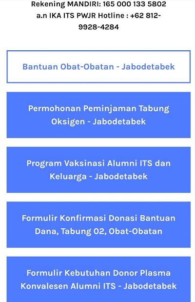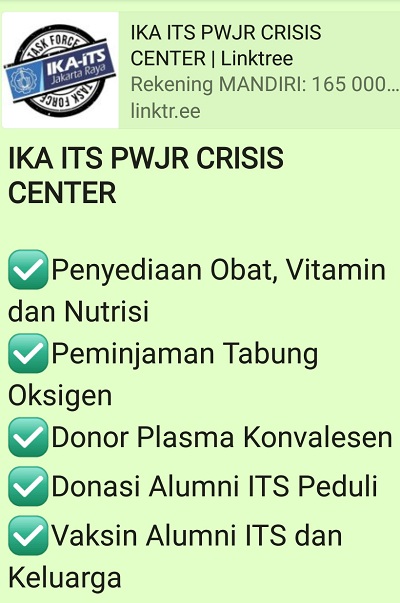 “Sebagai simpul awal jaringan komunikasi yang bisa menghubungkan dan menyalurkan bantuan dari alumni ITS kepada alumni ITS lainnya, termasuk keluarganya yang sedang mengalami terpapar virus covid 19 di area tersebut,” jelasnya..