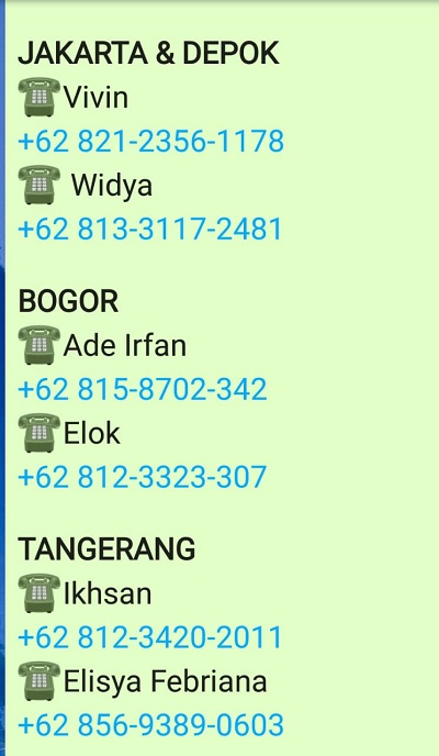 Kontak person yang bisa dihubungi diberbagai wilayah tercantum dibawah ini :