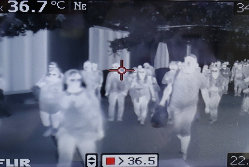 Pemindai suhu tubuh bekerja mengecek penumpang di bandara internasional Manila, Filipina, (23/1). Filipina telah melaporkan kematian pertama akibat virus corona.