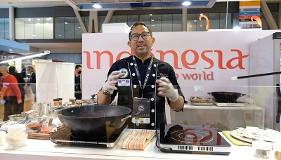 Booth pameran Indonesia yang memperagakan masakan Eropa ditambahkan rempah-rempah, ternyata cocok dan banyak yang menyukai