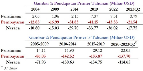 Pembayaran dividen dan bunga kepada investor asing pada 2022 naik lagi menjadi 43,33 miliar dolar AS, membuat defisit Neraca Pendapatan Primer naik menjadi 36,02 miliar dolar AS. Neraca Pendapatan Primer untuk tahun 2023 ini diperkirakan masih memburuk dari tahun 2022.