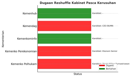 Rumor yang beredar menyebutkan setidaknya lima kementerian akan berganti nakhoda, termasuk pos-pos strategis di bidang keamanan, ekonomi, dan komunikasi publik. Beberapa nama yang disebut-sebut masuk radar penggantian adalah mereka yang dianggap gagal membaca situasi hingga kerusuhan membesar.