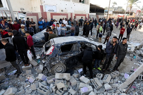 Warga Palestina berkumpul di samping kendaraan yang rusak saat mereka memeriksa lokasi serangan Israel, di tengah konflik yang sedang berlangsung antara Israel dan kelompok Islam Palestina Hamas, di Deir Al-Balah di Jalur Gaza tengah 10 Januari 2024. REUTERS/Mohammed Al- Masri