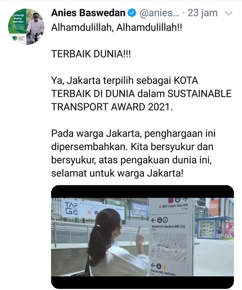 “Alhamdulillah, Jakarta terpilih sebagai kota terbaik dunia dalam Sustainable Transport Award 2021. Saya turut berbangga dengan pencapaian Jakarta dalam peningkatan inovasi transportasi terintegrasi. Ini adalah pengingat bahwa kami harus terus berupaya meningkatkan layanan transportasi yang sudah ada, sehingga kenyamanan warga dalam bertransportasi terjamin,” ucap Anies dalam keterangan resminya, Sabtu (31/10), yang juga tayang di akun twitter miliknya.