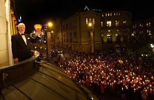 Pemenang Hadiah Nobel Perdamaian dan mantan Presiden AS Jimmy Carter menyambut prosesi obor dari balkon Grand Hotel di pusat kota Oslo, Norwegia, 10 Desember 2002. SCANPIX/Erlend Aas/via REUTERS