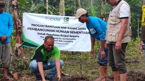 Bakti lanjutan MW KAHMI Jatim bekerjasama dengan Indonesia Care, melakukan peletakan batu pertama pembangunan Huntara untuk korban terdampak erupsi gunung Semeru di dusun Kamar Kajang Desa Sumberwuluh Candipuro, Minggu (13/2/2022)
