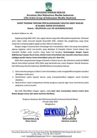 ZONASATUNEWS.COM, BEKASI – Selasa (22/11) melanjuti video acara sakral non muslim di komplek Islamic Center Bekasi Kesatuan Aksi Mahasiswa Muslim Indonesia (KAMMI) daerah Bekasi mengirimkan surat teguran kepada Islamic Center Bekasi karena dinilai bertele-tele dalam menyelesaikan penyalahgunaan fasilitas