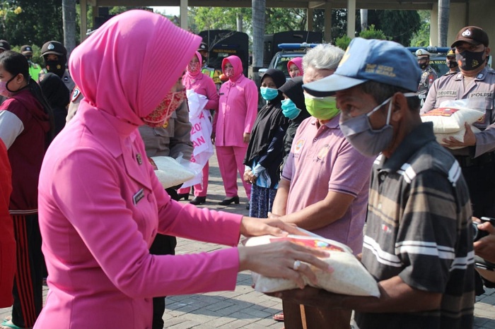 Kapolres Nganjuk AKBP Handono Subiakto SH.S.I.K MH didampingi Wakapolres Nganjuk Kompol Ki Ide Bagus Tri S.I.K saat memberikan bantuan paket beras mengatakan pihaknya sudah melakukan yang ketiga kalinya untuk disalurkan kepada warga terdampak virus corona sebagai bentuk bakti sosial.