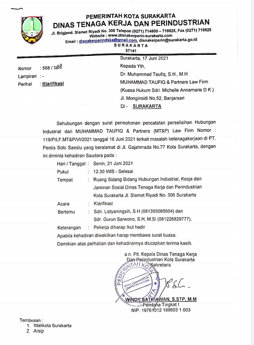 ZONASATUNEWS.COM, SOLO–Kasus pemecatan tanpa prosedural yang menimpa Michelle Annamarie D.K oleh PT Persis Solo Saestu berlanjut ke peradilan industrial ketenagakerjaan. Dinas tenaga Kerja Dan Perindustrian Kota Surakarta melayangkan surat panggilan kepada kuasa hukum pekerja, Dr Muhammad Taufiq SH,MH.