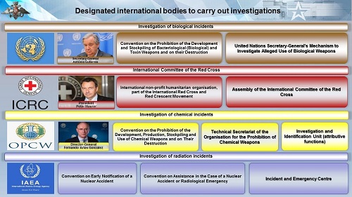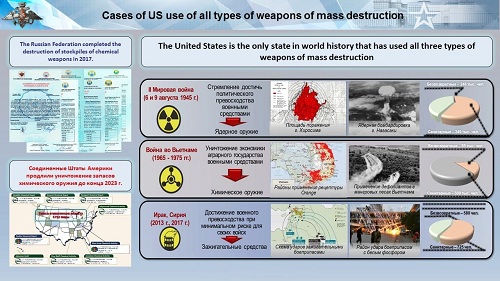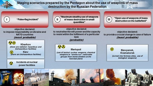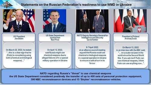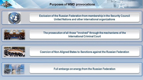 Kementerian Pertahanan Rusia mempunyai informasi tentang persiapan AS untuk melancarkan provokasi untuk menuduh Angkatan Bersenjata Rusia dalam penggunaan senjata nuklir, biologi, atau kimia. Rencana tersebut sudah siap dan merupakan balasan atas kesuksesan operasi militer khusus Rusia.