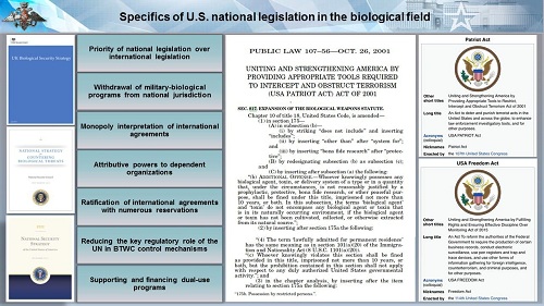 Mengingat pemblokiran oleh Amerika Serikat atas inisiatif internasional apa pun untuk memverifikasi Konvensi Senjata Biologis (Toksin), ada prasyarat untuk melanggar perjanjian internasional tentang nonproliferasi senjata biologis.