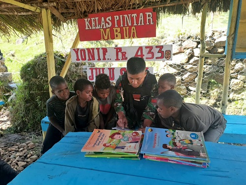 Satgas Yonif PR 433/JS berinisiatif untuk mengadakan kegiatan “Kelas Pintar” di Pos Satgas, untuk membantu tenaga pendidik anak-anak di wilayah Distrik Mbua, kegiatan ini juga bertujuan untuk membentuk karakter cinta Tanah Air yang ditanamkam sejak dini kepada anak-anak di Distrik Mbua.