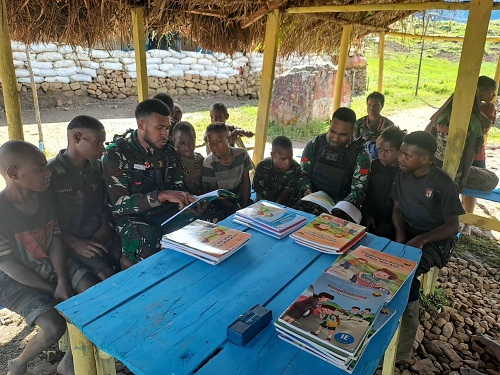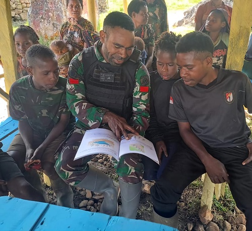 Kelas Pintar: Personel Satgas Pamtas Mobile Yonif Para Raider 433/JS Kostrad mengadakan kegiatan belajar di Kelas Pintar yang diadakan disekitar lingkungan Pos Satgas di Distrik Mbua, Kab. Nduga, Papua. Selasa, (06/08/2023).