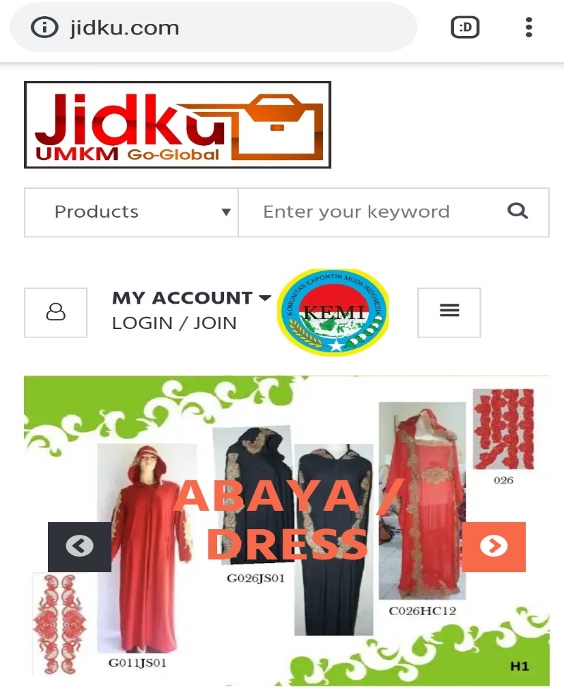 ZonasatuNews mencoba masuk portal jidku.com. Berbagai produk garmen (abaya/dres) berbagai kategori terpampang. Juga dijelaskan jenis bahannya. Kita juga dapat menghubungi supplier secara langsung.