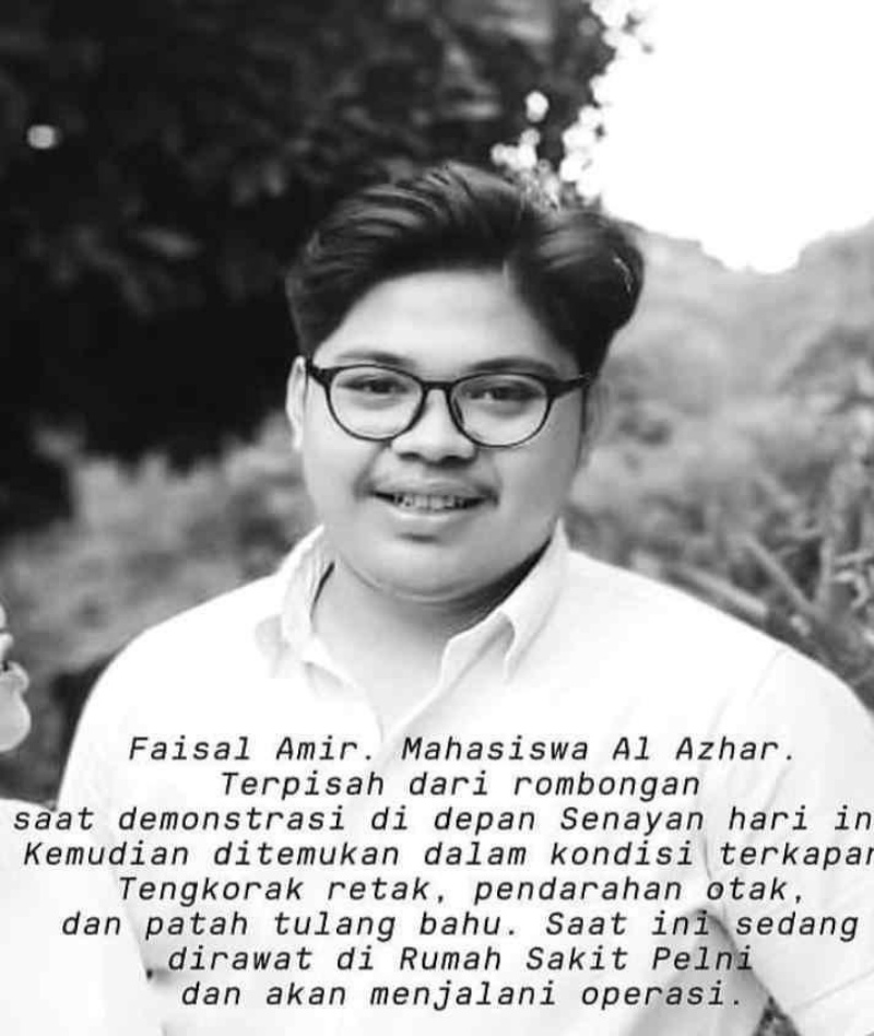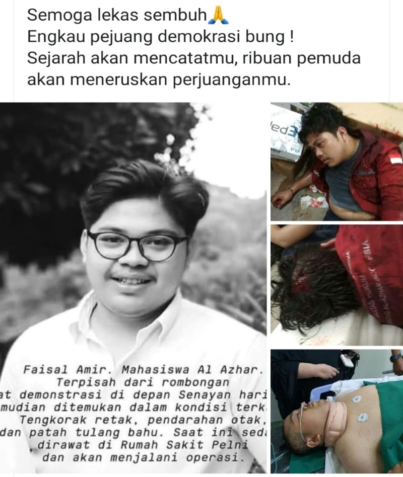 Jakarta, Zonasatu News –Namanya Faisal Amir.Mahasiswa Universitas Al Azhar Jakarta. Saat demo di gedung DPR RI kemarin, Selasa (24/9/2819) kepalanya pecah dan bahunya patah. Akibatnya terjadinya pendarahan di batang otaknya.