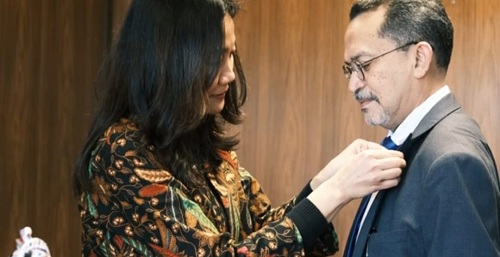 Sinta Kartikasari manager sekolah internasional GSD di Madrid menyematkan pin pengargaan kepada Dubes Muhammad Najib atas kerjasama yang telah terbangun