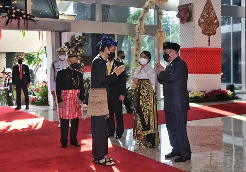 Keterangan Foto:Ketua DPD RI bersama Ketua MPR RI dan Ketua DPR RI menyambut kedatangan Presiden dan Wakil Presiden RI di Gedung Nusantara, Kompleks Gedung Parlemen, Senin, 16 Agustus 2021.