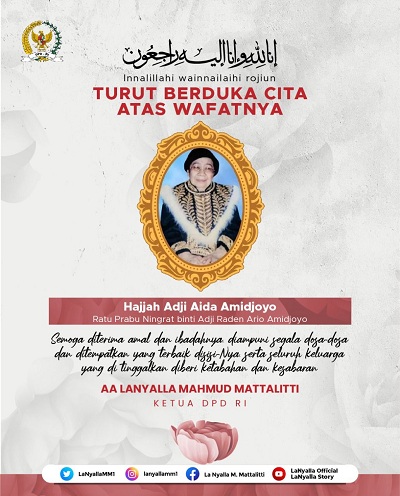 ZONASATUNEWS.COM — Keua DPD RI AA LaNyalla Mahmud Mattalitti turut berduka cita atas wafatnya Yang Mulia Hajjah Adji Aida Amidjoyo (Ratu Prabu Ningrat) binti Adji Raden Ario Amidjoyo KESULTANAN KUTAI KARTANEGARA ING MARTADIPURA pada hari Minggu, 19 Desember 2021 pukul 09.45 Wita di RSU Parikesit Tenggarong.