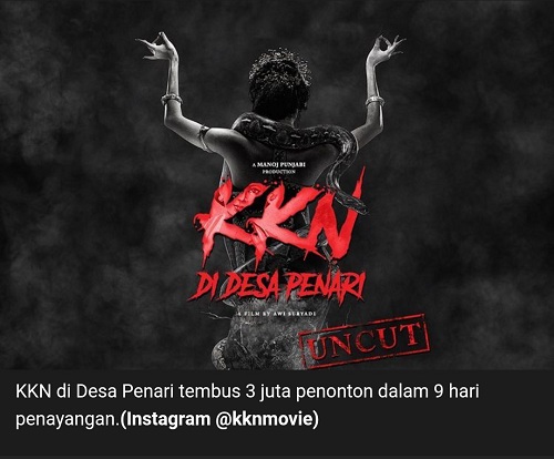 ZONASATUNEWS.COM – Film KKN di Desa Penari mencatatkan jumlah penonton sebanyak lebih dari 3,7 juta dalam 11 hari tayang, hampir menuju 4 juta penonton.