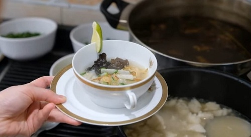 Dubes Muhammad Najib menyajikan menu nasi rawon, tempe orek, tahu isi, ditambah dengan sup Palembang (sup tekwan).