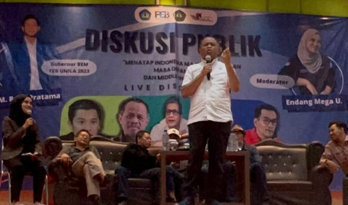 Koordinator Sekber KIB Habil Marati berceramah didepan Mahasiswa UNILA dalam Acara Diskusi Publik, Kamis (14/9/2023)