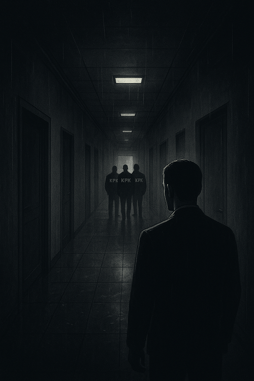 Ia memutuskan kembali ke ruang kerja, mencoba menenangkan diri. Tapi detik berikutnya, pintu ruangannya terbuka. Beberapa pria berpakaian gelap masuk, wajah mereka tanpa ekspresi, jaket bertuliskan tiga huruf yang sangat ia kenal: KPK.