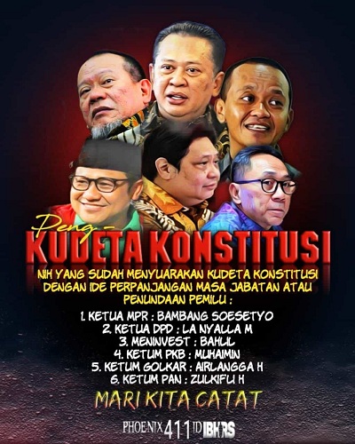 Semua daya di upayakan agar Rezim Jokowi ini tetap lanjut.Para Oligarkhys yang berpesta pora selama 8 th ini nampaknya belum cukup Wareg. Mengelabui Rakyat dengan beking hukum melalui UU Minerba, UU IKN, UU Omnibuslaw ,dll semua dalam rangka kepentingan merampok resource semata.
