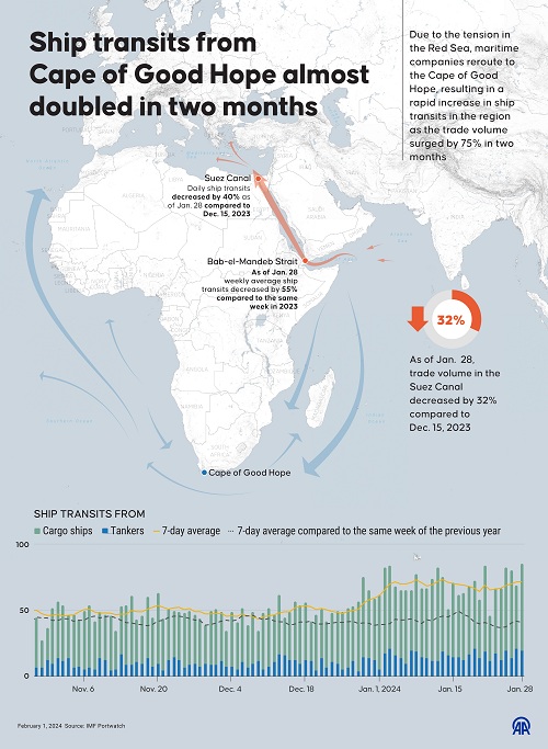 ISTANBUL, TURKIYE – 1 FEBRUARI: Infografis berjudul ”Transit kapal dari Tanjung Harapan hampir dua kali lipat dalam dua bulan” dibuat di Istanbul, Turkiye pada tanggal 1 Februari 2024. Karena ketegangan di Laut Merah, perusahaan maritim mengalihkan rute ke Tanjung Harapan, mengakibatkan peningkatan pesat transit kapal di wilayah tersebut seiring dengan melonjaknya volume perdagangan sebesar 75% dalam dua bulan. ( Muhammad Ali Yiğit – Anadolu Agency )