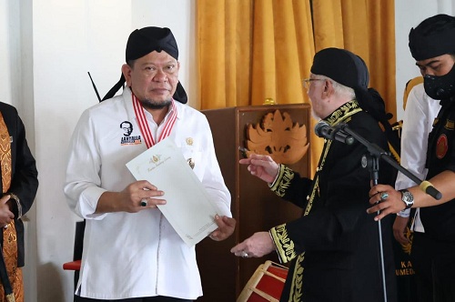 KETERANGAN FOTO ;Ketua DPD RI mendapat gelar kehormatan sebagai Tokoh Kebudayaan Nusantara, dengan gelar Adhi Ksatria Budhaya Pratama, dari Karaton Sumedang Larang (KSL), Sabtu (21/8/2021).
