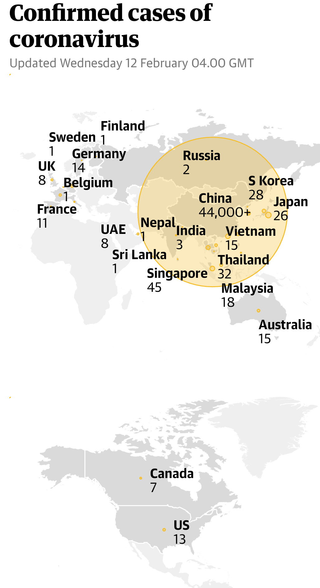 “Dengan 99% kasus di China, ini tetap sangat darurat bagi negara itu, tetapi yang memiliki ancaman sangat besar bagi seluruh dunia,” kata direktur jenderal WHO Tedros Adhanom Ghebreyesus dalam pidato pembukaannya. Hingga saat ini Cina telah melaporkan 42.708 kasus yang dikonfirmasi, termasuk 1.017 kematian, kata Tedros.