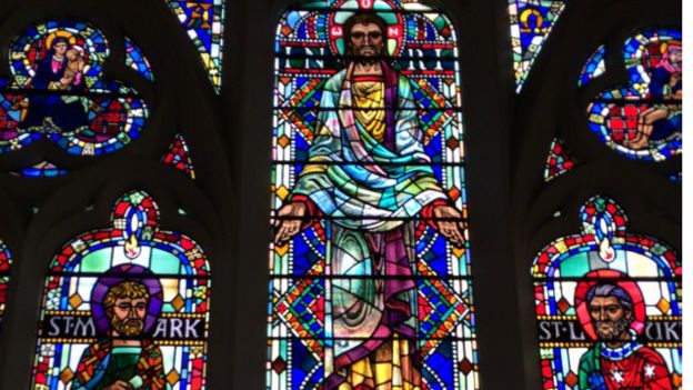 Lukisan kaca Yesus yang masih tetap dipertahankan.