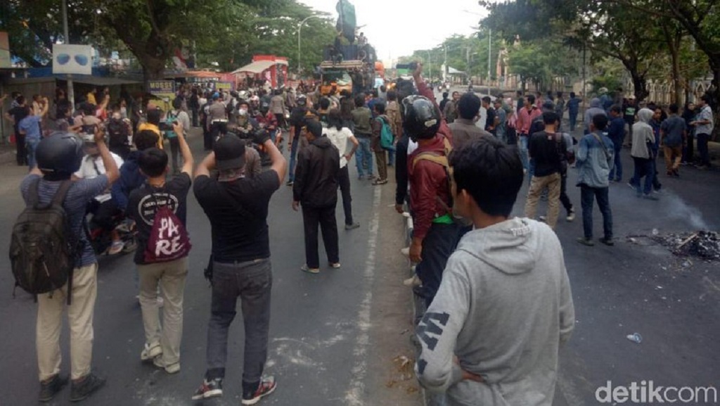 Mahasiswa berunjuk rasa dengan memblokade Jalan Sultan Alauddin menggunakan mobil kontainer. Aksi blokir inilah yang memicu adanya kericuhan karena ada suporter klub bola yang mau melewati lokasi.