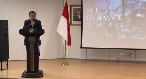 ZONASATUNEWS.COM, MADRID – Dubes Muhammad Najib menghadiri Musyawarah Besar Perhimpunan Pelajar Indonesia (Mubes PPI) Spanyol 2023 yang dilaksanakan secara hybrid. Dubes Najib memberikan sambutan dari KBRI Madrid, sementara peserta Mubes berada di beberapa lokasi berbeda. Bahkan juga diikuti oleh PPI di berbagai negara.