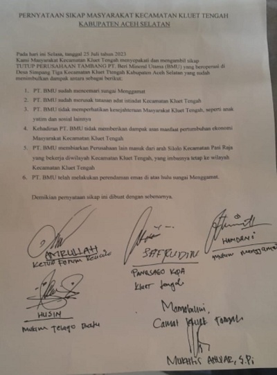 Dalam surat yang ditandatangani bersama pada Selasa, 25 Juli 2023 tersebut menyebutkan jika warga setempat menyepakati dan mengambil sikap untuk menututup tambang PT BMU yang beroperasi di Desa Simpang Tiga Kluet Tengah yang dinilai banyak menimbulkan dampak lingkungan, yakni pencemaran Sungai Manggamat serta merusak tatanan adat istiadat Kecamatan Kluet Tengah.