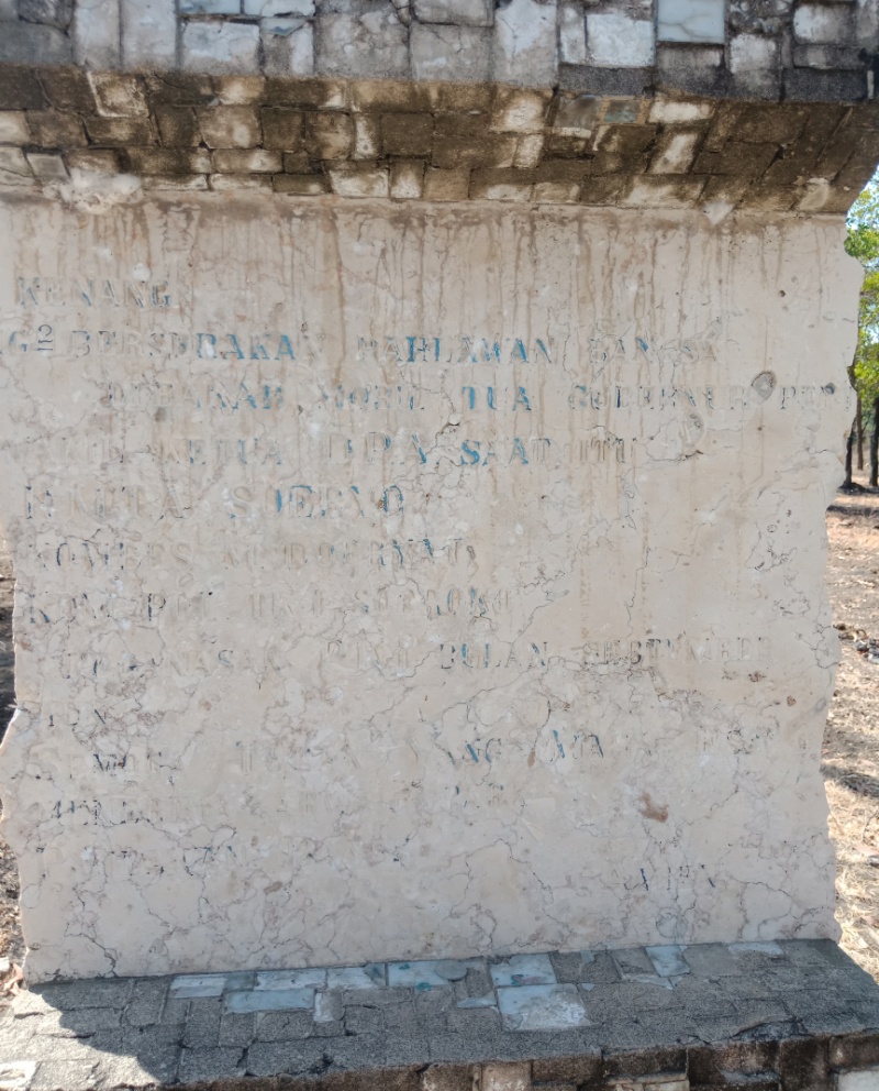 Menurut rekaan penulis yang mencoba menggabungkan tulisan-tulisan yang putus, karena batu prasasti rusak, prasasti itu berbunyi: ” KENANG-KENANG. TULANG-TULANG BERSERAKAN PAHLAWAN BANGSA.TELAH DIBAKAR MOBIL TUA GUBERNUR PERTAMA, WAKIL KETUA DPA SAAT ITU, RMTA SOERYO, KOMBES M DOERYAT, KOMPOL TK I SOEROKO, OLEH KEGANASAN PKI BULAN SEPTEMBER MADIUN, SEMOGA TUHAN YANG MAHA ESA MENERIMA ARWAH PARA PAHLAWAN BANGSA. AMIEN”
