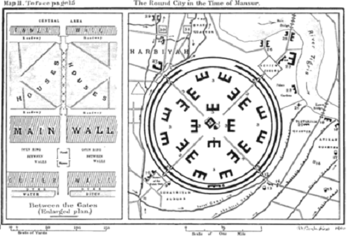 Kota Bulat adalah ciri khas Bagdad, yang dibangun oleh Khalifah Abbasiyah al-Mansur pada 762–766 M sebagai kediaman resmi istana Abbasiyah. Nama resminya di masa Abbasiyah adalah Kota Damai ( Arab: Madīnat as-Salām ). Baitul Hikmah, yang terkenal sebagai Rumah Kebijaksanaan terletak di dalam pekarangan Khalifah.