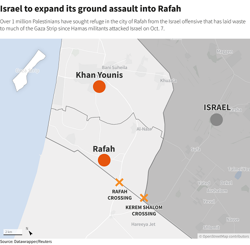 Perdana Menteri Israel Benjamin Netanyahu menggambarkan Rafah sebagai “benteng terakhir” Hamas, dengan empat batalyon bersenjata, dan bahwa Israel tidak dapat mencapai tujuannya untuk melenyapkan kelompok tersebut jika mereka masih berada di sana.