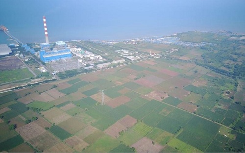 Area proyek GRR Tuban terlihat berupa lahan reklamasi luas di tepi pantai, dengan aktivitas konstruksi (meski masih terbatas).