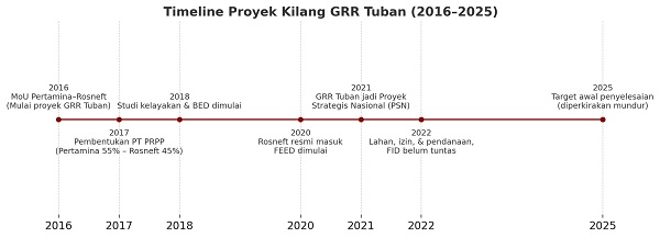Pembangunan Kilang Tuban (Grass Root Refinery/GRR) Tuban, yang digadang-gadang menjadi salah satu Proyek Strategis Nasional (PSN), tak lepas dari kontroversi. Sejak awal, kerja sama dengan Saudi Aramco menggantikan Rosneft (perusahaan minyak asal Rusia), yang diharapkan menjadi backbone proyek itu justru bubar di tengah jalan. Pertamina kemudian melanjutkan sendiri dengan menggandeng mitra lain, namun hingga kini progresnya tersendat.