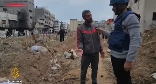 “Tidak ada lagi yang bisa kami lakukan, sejumlah besar mayat digali dan dimutilasi ketika pasukan pendudukan melibas daerah tersebut sayangnya jumlahnya sangat mengejutkan kami menemukan mayat-mayat di atas tanah setelah Israel menggalinya sekarang kami sedang mengantre mayat-mayat sanak saudara kami untuk ditimbun kembali,” kata warga Gaza.