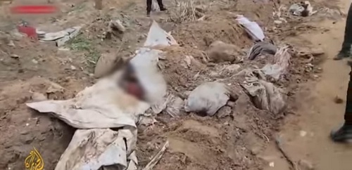 Dalam prosesnya, sejumlah besar mayat tergeletak di luar kuburan mereka setelah digali oleh pasukan Israel di sini kita bisa melihat lebih dekat sisa-sisa jenazah yang dikuburkan di Pemakaman.