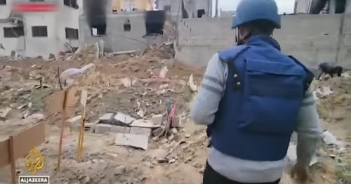“Ini adalah kotak amunisi kosong yang digunakan oleh pasukan pendudukan di Kota Gaza. Anda dapat melihat roket-roket yang dikuburkan digunakan oleh tentara mereka yang membuang selongsong kosong di sini setelah mereka melibas pekuburan, menggali mayat para korban dan mengemudikan kendaraan di atasnya,” katanya.