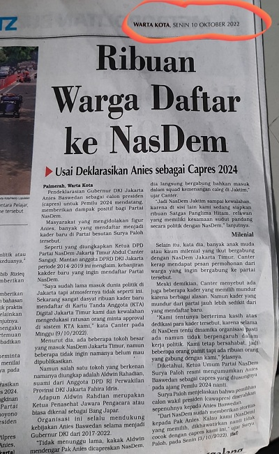 Kita harus lanjutkan membantu Nasdem (Surya Paloh) dari serangan dahsyat yang terus digaungkan oleh media pro-status qou, bahwa “Pencalonan Pak Anies oleh Nasdem banyak ditinggal kader Nasdem…” Itu inti narasinya. Berita itu diulang-ulang pdahal faktanya hanya 1 orang pengurus, tapi yang masuk dan simpati ke Nasdem dengan Pencalonan Pak Anies justru lebih banyak, tapi ini tidak dikabarkan. Inilah fakta bahwa media sudah dikuasai para pemodal rakus.