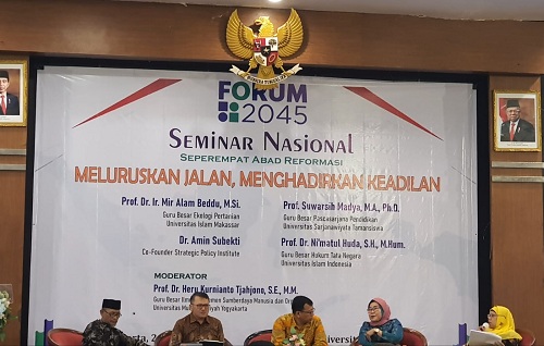 Forum 2045 menyelenggarakan Seminar Nasional Sepetempat Abad Reformasi: Meluruskan Jalan, Menghadirkan Keadilan, Senin, 20 Maret 2023 di Gadjah Mada University Club Hotel Yogyakarta.