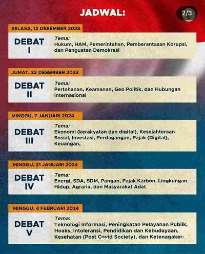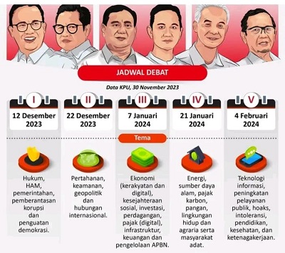 KPU telah resmi mengumumkan jadwal dan agenda lima putaran debat Capres dan Cawapres beserta tema-temanya sebagai berikut.