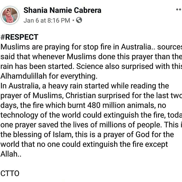 “Hari ini saya bergabung dengan saudara-saudari Muslim saya di Adelaide dalam doa untuk hujan,” kata misionaris Katolik itu, sambil membagikan foto-foto acara itu di Facebook.