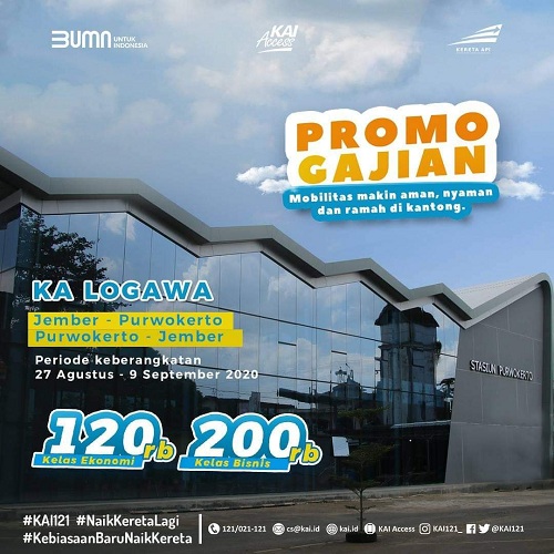 Ixfan menambahkan, sebagai wujud apresiasi kepada pelanggan khususnya pelanggan KA Logawa relasi Jember – Madiun – Purwokerto PP, dengan jadwal keberangkatan mulai tanggal 27 Agustus 2020 s.d 09 September 2020 pihaknya memberikan tarip untuk kelas ekonomi Rp 120.000, dan untuk kelas bisnis Rp 200.000.