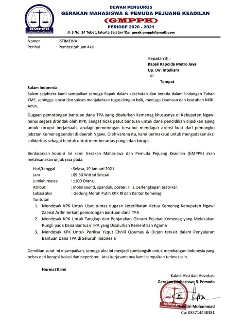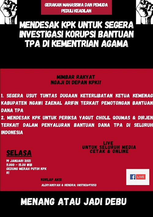 Dewan Pengurus Gerakan Mahasiswa dan Pemuda Pejuang Keadilan berencana akan melakukan aksi unjuk rasa didepan kantor KPK dan kantor Kementrian Agama. Dalam rilisnya kepada media, menyebutkan aksi tersebut akan diadakan besok pada hari Selasa (19/1/2021), pada sekitar pukul 09.30 WIB.