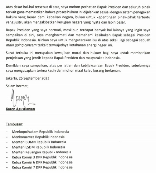 Dibawah ini surat Karen Agustiawan tersebut dimuat selengkapnya: