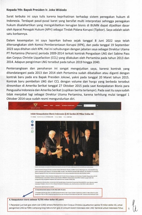 Dalam kesempatan ini saya laporkan bahwa sejak tanggal 8 Juni 2022 saya telah ditersangkakan oleh Komisi Pemberantasan Korupsi (KPK), dan pada tanggal 19 September 2023 saya ditahan oleh KPK. Hal ini sehubungan dengan jabatan saya sebagai Direktur Utama PT Pertamina (Persero) perioda 2009-2014 terkait kontrak Pengadaan LNG dari Sabine Pass dan Corpus Christie Liquefaction (CCL) yang dilakukan oleh Pertamina pada tahun 2013 dan 2014. Adapun pengiriman LNG tersebut pada tahun 2019 hingga 2040.